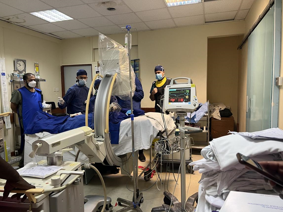 - A tiny catheter is inserted through a small puncture in the wrist or groin