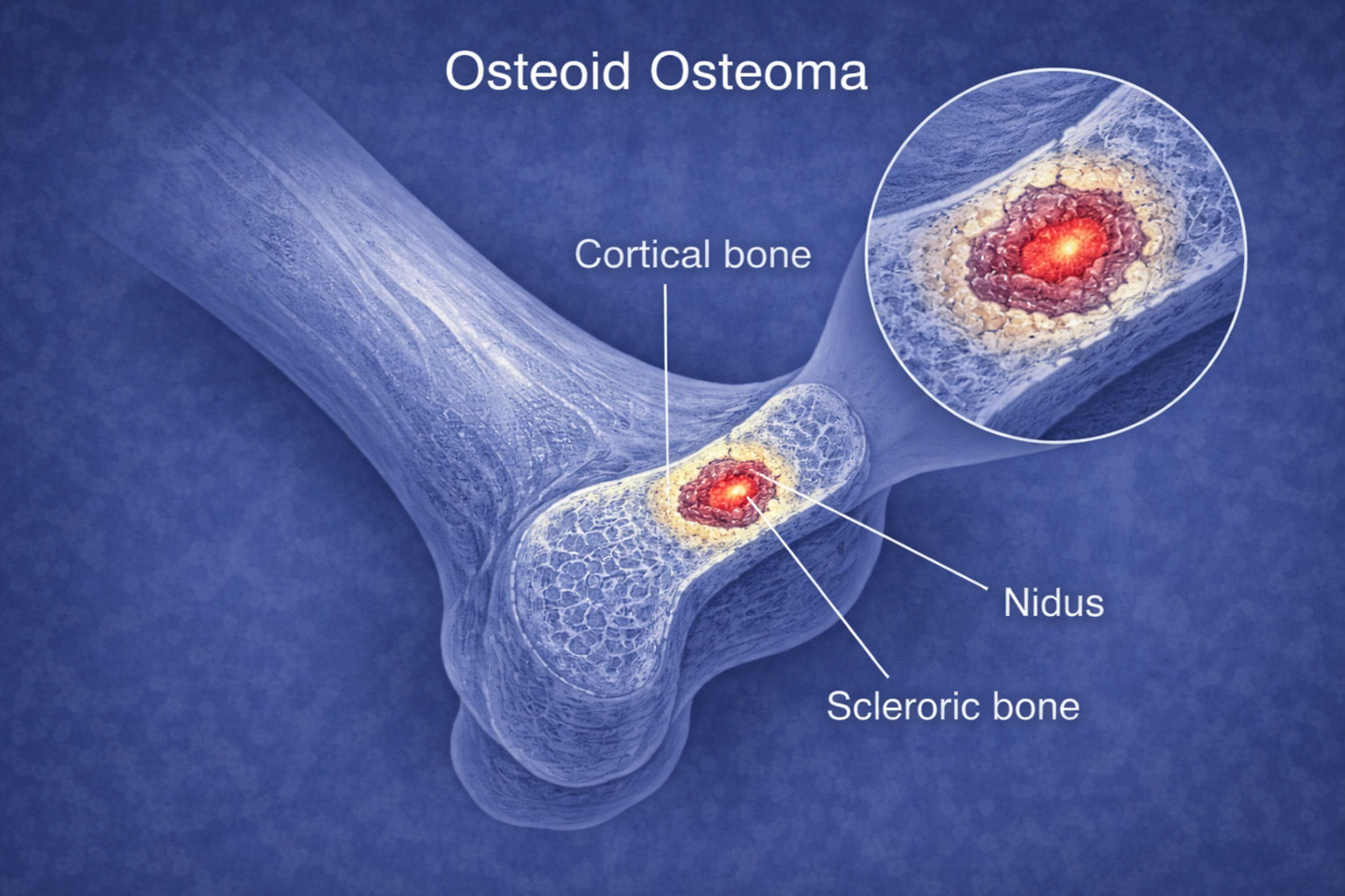 Osteoid osteoma is a small, benign bone tumor that can cause severe pain, especially at night. It commonly affects children, teenagers, and young adults.